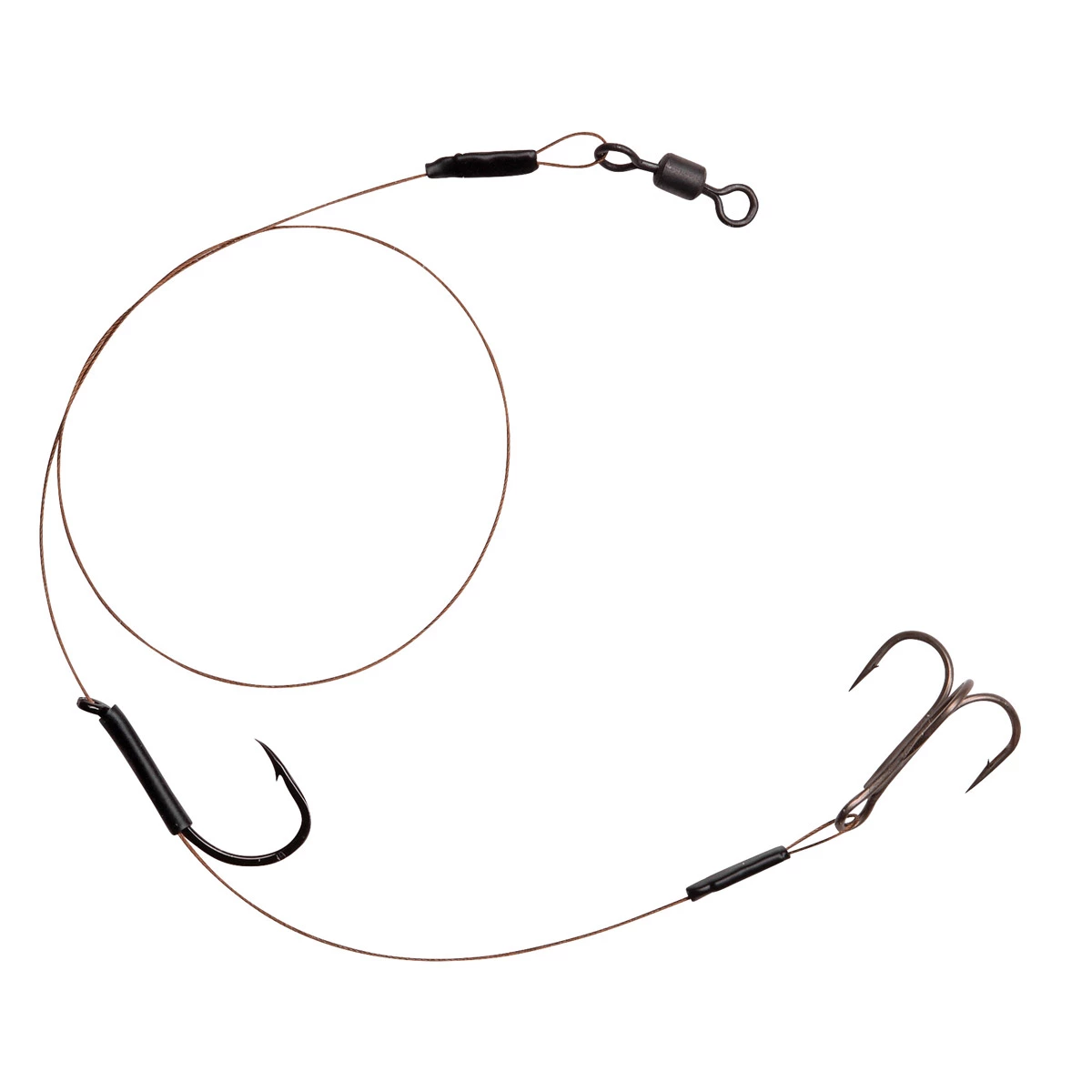 Topkwaliteit aasvis-rig voor montage op softbaits of aasvis. Gemaakt van onverwoestbaar 40 Lbs American Fishing Wire in camouflage bruine uitvoering. Het 7×7 (49strand ) RVS staaldraad is soepel en heeft weinig geheugen. De 1300 serie is gemaakt van 1 vaste gamakatsu dreg en 1 enkele schuivende haak. Prima rig voor kleine tot middelgrote aasvissen. Afgewerkt met krimpkous