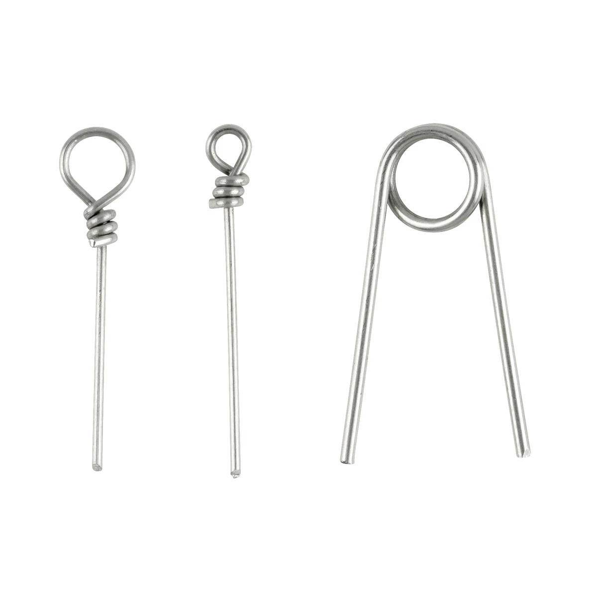 De 3 soorten RVS pinnetjes die je terugvindt in de kant en klare Spiral Stinger Rigs zijn voor de creatieve zelfbouwers eveneens los te verkrijgen als assorti pack. De pinnetjes met dubbele pootjes hebben als voordeel dat deze meer houvast hebben in de softbait, en daardoor uitermate geschikt zijn om de buikdreg mee te monteren. De enkel poots pinnetjes zijn ideaal in kleinere softbaits of bij een staartdreg bevestiging.